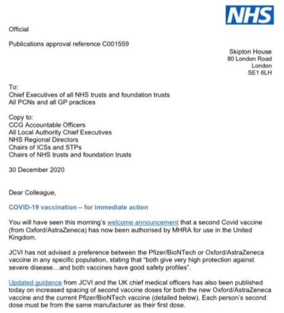 Added to this, on the 30th of December Simon Stevens, Chief Executive of the NHS, wrote to all the areas of the NHS that might be involved in vaccinations stating "Each person's second dose must be from the same manufacturer as their first dose."